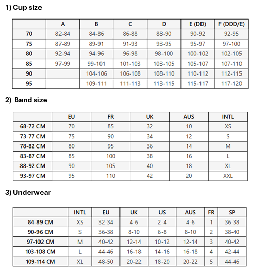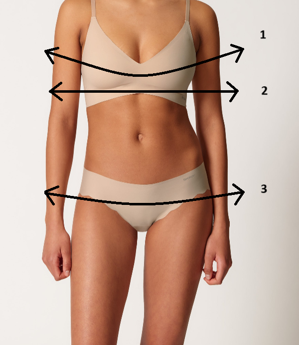 1) Borstomvang: Meet rond het volste gedeelte van je borst, houd het meetlint recht en niet te strak. Dit is je borstomvang.